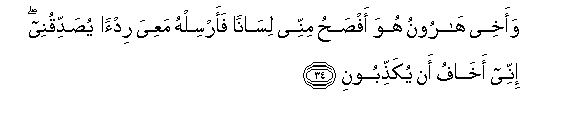 “And my brother Haroun is more eloquent than me in speech. Therefor send him with me as a helper to confirm me. Lo ! fear that they will give the lie to me”. (verse 34, Surah Al Qasas).