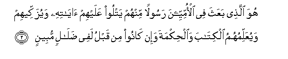 “He it is who hath sent among the illiterates a messenger of their own, to recite unto them His revelations, and to make them grow, and to teach them the Book and Wisdom, though heretofore they were in error manifest” (Surah, Al Gum’a, verse 2).