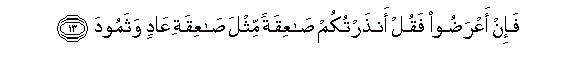 “But if they turn away, then say: I warn you of a thunderbolt like the thunderbolt (which fell of old upon the tribes of ‘Aad and Thamud) Otbah then, putting his hand to the Prophet’s mouth, besought him to forbear. Returning to his people he was asked how he fared. He answered: “By God, I never heard such speech before. It is neither poetry, nor oracular rhyme, nor magic. O ! people of Quraish! Obey me and make me responsible. Let the man be, he and his mission. By �����