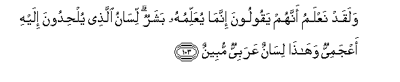 “And we know well that they say :Only a man teacheth him. The tongue of him at whom they falsely hint is foreign, and this is illuminating Arabic speech” . (Surah: Al Nahl, verse 103).