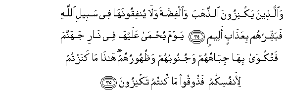 “They who hoard up gold and silver and spend it not in the way of Allah, unto them give tidings(O Muhammad) of a painful doom. On the day when it will (all) be heated in the fire of hell, and their foreheads and their flanks and their backs will be branded therewith (and it will be said unto them): Here is that which ye hoarded for yourselves Now taste of what ye used to hoard”. (Surah: Al Tobata, verses 34 and 35).