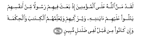 “Allah verily hath shown grace to the believers by sending unto them a messenger of their own who reciteth unto them the S?riptures and wisdom, although before (he came to them) they were in flagrant error”. (Surah Al `Imran, verse 164)