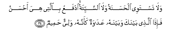 “A benevolent act and a mischievous one can never be equal. For a mischief done to you, return an act of benevolence. This would transform your enemy into a faithful friend”. (a free translation of verse 34)
