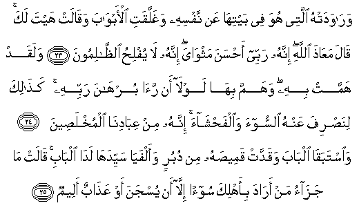 24.- “She verily desired him, and he would have desired her if it had not been that he saw the argument of his Lord. Thus it was, that We might ward off from him evil and lewdness. Lo ! he was of Our chosen slaves”.