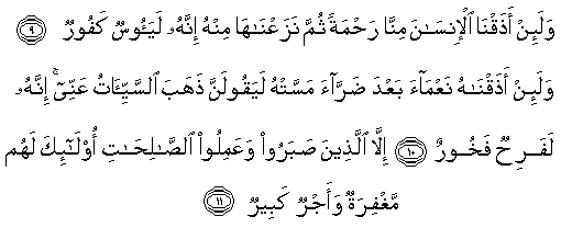“And if we cause man to taste some mercy from Us thankless. And if we cause him to taste grace after some misfortune that had befallen him, he saith: The ills have gone from me! Lo! he is exultant, boastful. Save those who persevere and do good work. Theirs will be forgiveness and great reward”. (Surah : Hud, verse 9-11)