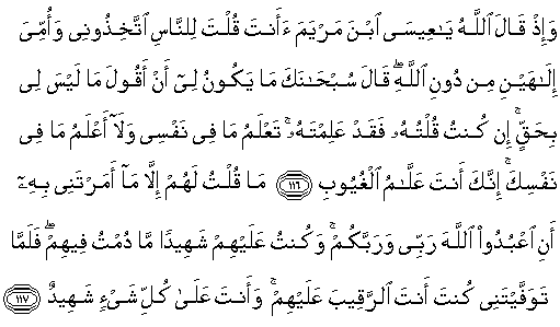 “And when Allah saith : O Jesus, son of Mary! Midst thou say to people: Take me and my mother for two gods beside Allah ? He saith : Be glorified ! It was not mine to utter that to which I had no right. If I used to say it, then Thou Knewset it. Thou Knowest what is in my mind, and I know not what is in Thy Mind. Lo Thou, only Thou, art the Knower of Things Hidden.