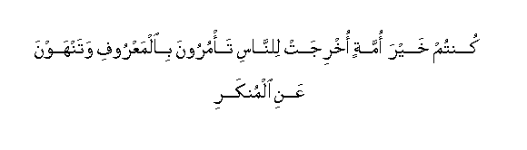 “Ye are the best community that hath been raised up for mankind. To enjoin right conduct and forbid indecency; and ye believe in Allah”.
