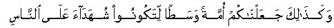“Thus we have appointed you a middle nation that ye may be witnesses against mankind, and that the Messenger may be a witness against you”. (Surah II, 143 in part).