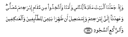 &n?sp; “And I remember when we made the House (at Mecca) a resort for mankind and a sanctuary (saying) Take as your place of worship tile place where Abraham stood (to pray). And We imposed a duty upon Abraham and Ismail (saying) : Purify My House for those who go around and those who meditate therein and those who bend down and prostrate themselves (in worship) !. (Surah II, 125).