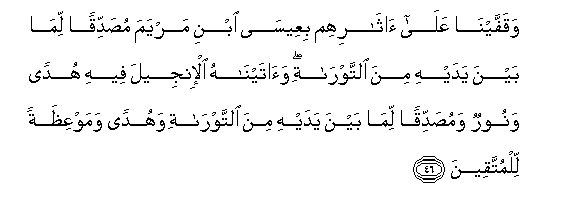 “Lo ! We did reveal the Torah, where in is guidance and light, by which the Prophets who surrendered (unto Allah) judged the Jews, and the rabbis and the doctors (judged) by such of Allah’s Scripture as they were bidden to observe, and thereunto were they witnesses So fear not mankind, but fear Me. And barter not My revelations for a little gain. Whoso judgeth not by that which Allah hath revealed : such are disbelievers.. And We caused Jesus, Son of Mary, to follow in their footsteps; confirming that which was (revealed) before him in the Torah and We bestowed on him the Gospel wherein is guidance and light, confirming that which was (revealed) before it in the Torah – a guidance and an admonition unto those who ward off (evil) And unto thee have We revealed the Scripture with the truth, confirming whatever Scripture was before it, and a watcher over it” (Surah V, verses 44, 46, 48 – in part).