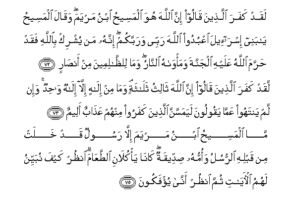 73) “They surely disbelieve who say : Lo ! Allah is the third of three ; when there is no God save the One God. If they desist not from so saying a painful doom will fall on those of them who disbelieve”.