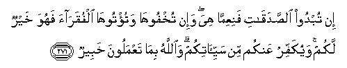 “If you publish your alms-giving, it is well, but you hide it and give it to the poor, it will better for you and will atone for some of your ill-deeds. Allah Informed of what ye do”. (Surah Al Baqara, ver. 271).
