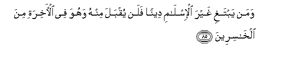 “And he whoso sekeeth as religion other than Islam (the Surrender to Allah) it will not be accepted from him and he will be a loser in the Hereafter” . (Surah Al -Imran, ver. 85).