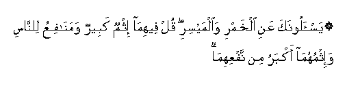 “They question thee about wines and games of chance. Say : In both is great ?in and some utility for men ; but the sin of them is greater than their usefulness”. (Surah Al Baqara, verse 299 in part).