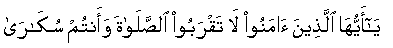 “O ye who believe ! Draw not near unto prayer when ye are drunken, till ye know that which ye utter”. (Surah Al Nisaa, verse 43 in part).