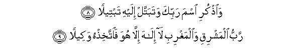 “And remember the name of thy Lord and devote thyself to Him with a complete devotion Lord of the East and the West ; there is no God save Him ; so choose Him, alone for thy defender”. (Surah 73, ver 8, 9).