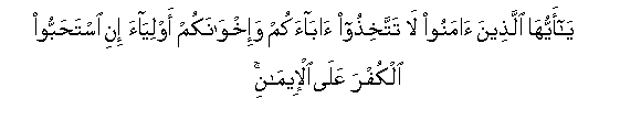 “O ye who believe ! Choose not your fathers nor your brethren for friends if they take pleasure in disbelief rather than faith”. (Surah Al-Tawbah, verse 23 in part).
