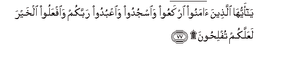 “O ye who believe ! Bow down and prostrate your selves, and worship your Lord and do good, that ye may prosper” (Surah Al Hag, verse 77) .
