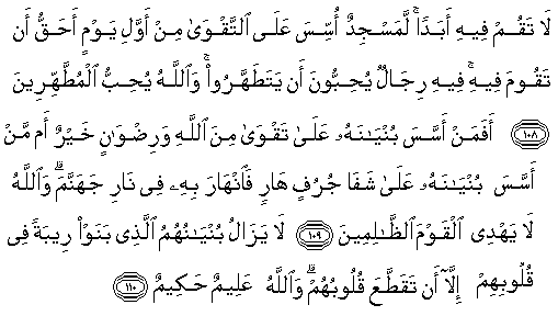 “Never stand in it. A place of worship which was founded upon duty to (Allah) from the first day is more worthy that thou shouldst stand (to pray) therein wherein are men who love to purify themselves Allah loveth the purifiers. Is he who founded his building upon duty to Allah and His good pleasure better; or he who founded his building on the brink of a crumbling overhanging precipice so that it toppled with him into the fire of bell ? Allah guideth not wrongdoing folk. The building which they built will never cease to be a misgiving in their hearts, unless their hearts are to be torn to pieces. Allah is Knower, Wise ( Surah ?l-Tawbah, verses 108-110).