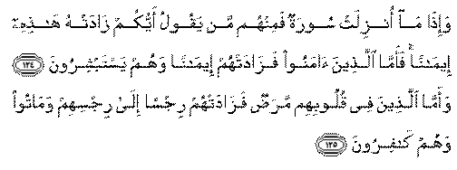 “And when ever a surah is revealed there are some of them who say : which one of you hath this increased him in faith? As for those who believe, it hath increased them in faith and they rejoice (therefor) as for those in whose hearts is disease, it only addeth wickedness to their wickedness, and they die while they are disbelievers”.
