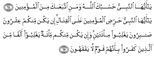 “Oh! Prophet ! Allah is sufficient for thee and those who follow thee of the believers. O Prophet Exhort the believers to fight. If there be of you twenty steadfast they shall overcome two hundred, and if there be of you a hundred steadfast they shall overcome a thousand of those who disbelieve, the latter being ignorant and unwise”. (Surah Al Anfal, ver. 64, 65).