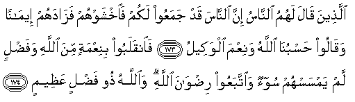 “Those unto whom men said: Lo the people have gathered against you, therefore fear them, (the threat of danger) but increased them in faith, and they said: Allah is sufficient for us! Most excellent is He in whom we trust ! So they returned with favour from Allah, and no harm touched them. They followed the good pleasure of Allah, and Allah is of Infinite bounty”. (Surah Al `Imran, verses 173,174).