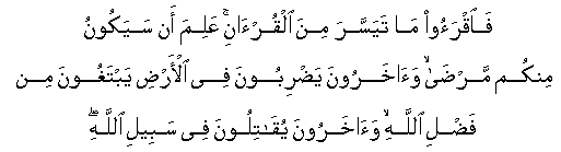 “Recite, then, of the Qur’an that which is easy for you; He knoweth that there are sick folk among you, and some who seek of Allah’s bounty, while others (still) fight for the cause of Allah ! (Surah 73, verse in part).
