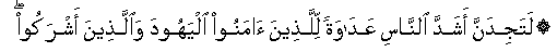 “Thou wilt find the most vehement of mankind in hostility to those who believe (to be) the Jews and the idolaters”. (Surah V, 82 – in part).