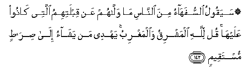 “The foolish of the people will say : what bath turned them from the Qiblah which they formerly observed ? Say Unto Allah belong the East and the west. He guideth whom he will unto a straight path” . (Surah II, 142).