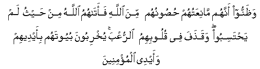 “They deemed that their strongholds would protect them from Allah. But Allah reached them from a place they reckoned not, and cast terror in their hearts so that they ruined their houses with their own hands and the hands of the believers” , (Surah 59, 2 in part).