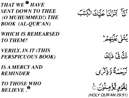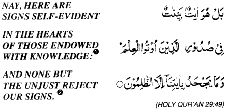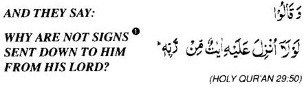 In the following AAYAAH [8] (verse) the Holy Prophet is made to point to the Holy Qur’an itself as an answer to their hypocritical demand for some special kind of “Sign” or “Miracle” for which their foolish, pagan mentality craved. For indeed all miracles are “signs”; and it is their disbelief, their scepticism, their lack of faith which motivates their request for a sign. They are asked to – “Look at the Qur’an” And again, “Look at the Qur’an!”