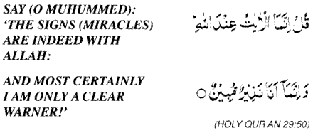 Some six hundred years after the birth of Jesus Christ (pbuh), Muhummed (pbuh) the Messenger of God was born in Makkah in Arabia. When he proclaimed his Mission at the age of forty, his fellow countrymen, the MUSHRIKS[5] of Makkah made an identical request for Miracles, as had the Jews, from their promised Messiah. Text book style, it was as if the Arabs had taken a leaf from the Christian records. History has a habit of repeating itself!