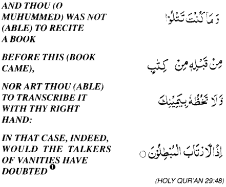 The Author of the Qur’an is reasoning with us, that had Muhummed (pbuh) been a learned man, and had he been able to read or write, then in that case the babblers in the market places might have had some justification to doubt his claim that the Holy Qur’an is God’s Word. In the event of Muhummed (pbuh) being a literate person, the accusation of his enemies that he had probably copied his Book (AI-Qur’an) from the writings of the Jews and the Christians, or that perhaps he had been studying Aristotle and Plato, or that he must have browsed through the “Torat,” the “Zabur” and the “Injeel”[13] and had rehashed it all in a beautiful language, might have carried some weight. Then, “THE TALKERS OF VANITIES” might have had a point. But even this flimsy pretence has been denied to the unbeliever and the cynic: a point hardly big enough to hang a fly upon![14]