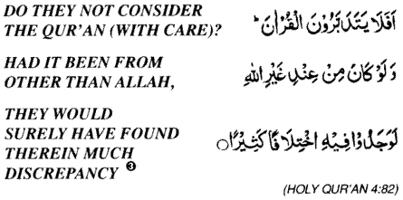 It is inconceivable that any human author would remain consistent in his teachings and his preachings for a period of over two decades. From the age of forty, when Muhummed (pubh) received his first call from Heaven to the age sixty-three when he breathed his last, for twenty three years the Holy Prophet practised and preached Islam. In those twenty three years, he passed through the most conflicting vicissitudes of life. Any man, during the course of such a mission, would be forced by circumstances to make “honourable” compromises, and cannot help contradicting himself. No man can ever write the same always, as the Message of the Holy Qur’an is: CONSISTENT WITH ITSELF, throughout! Or is it that the unbelievers’ objections are merely argumentative, refractory, against their own better light and judgement?
