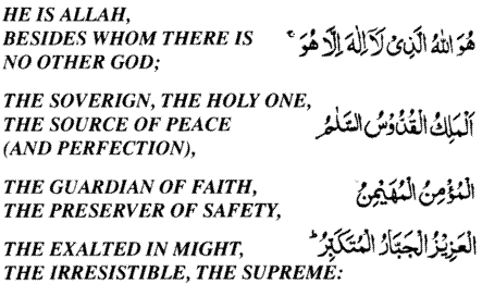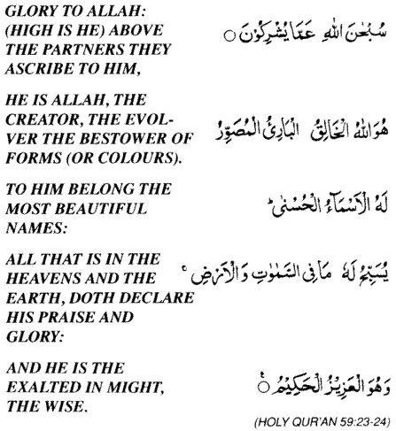 “THE MOST BEAUTIFUL NAMES”In the two verses quoted above, we count thirteen of the ninety-nine attributes interspersed throughout the Holy Qur’an. Even the most jaundiced and inimical opponent of Islam will be forced to admit that even in its translated form the attributes and the phraseology are beautiful and unique. In its original Arabic the wordings and their construction are absolutely inimitable and sublime.