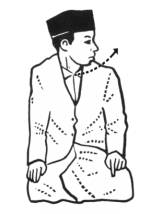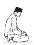 6- Then, raising his hands and body and sinking backward upon his heels, and placing his hands upon his thighs, he says the takbir, i.e. Allâhu akbar (God is Greater). This is called the first jalsa, i.e. the first sitting (see Fig. 7).